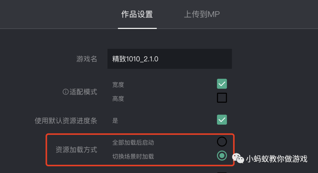 在小游戏制作工具中打开“作品设置”,其中有一个“资源加载方式”的选项,默认选择的是“全部加载后启动”。