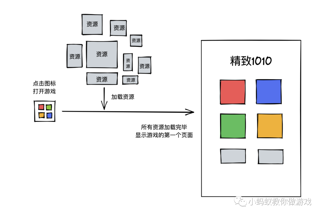 如图,当点击图标打开游戏时,会发生如下的过程:在正式进入游戏前,先把整个游戏需要的所有资源都加载好,这些资源都包含什么呢?图片,声音,积木块代码,总之所有供这个游戏运行所需要的东西都是资源,在所有的资源都加载完毕后,接下来才显示游戏的第一个首页面。