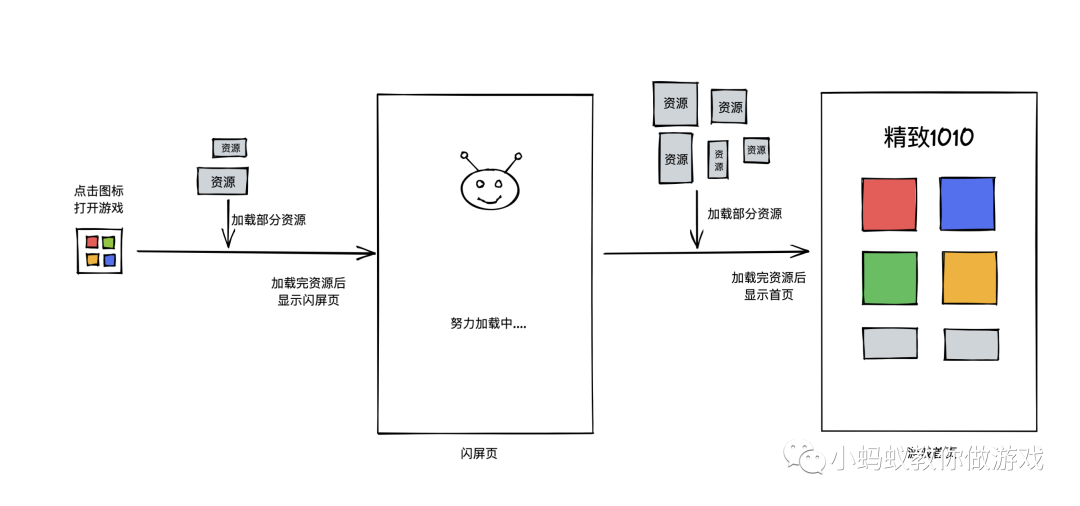 点击图标打开游戏,依然需要加载资源,但是此时并不需要加载游戏中的所有资源,只需要将第一个闪屏页需要用到的资源加载完成就够了,所以相当于只需要加载少量的资源即可打开“闪屏页面”。接下来,在闪屏页面中再次加载资源,这次需要加载的资源是“游戏首页”需要用到的资源,加载完这部分资源后,就可以显示“游戏首页”了。
