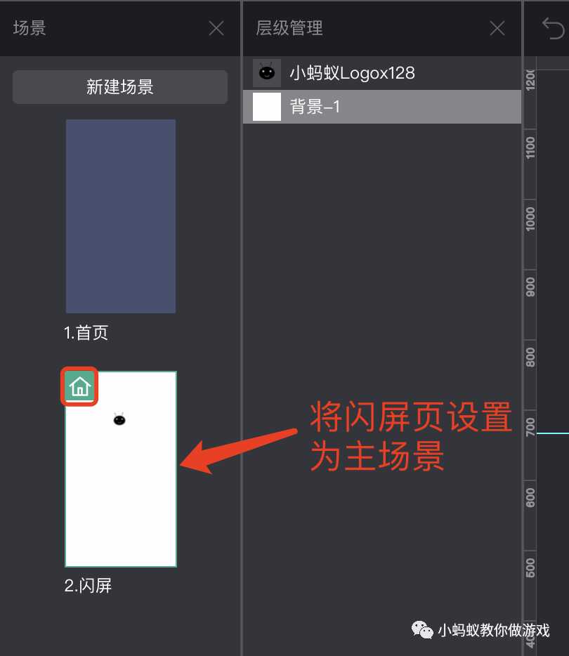 制作起来非常的简单,创建一个“闪屏”场景,并且把它设置为“主场景”,这个场景中的内容非常少,只包含一个 LOGO 以及一个默认的背景。
