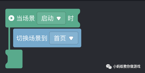 然后在闪屏场景增加如下的积木块,其实只做了一件事,就是当“闪屏”场景启动时,立刻切换到“首页”场景。