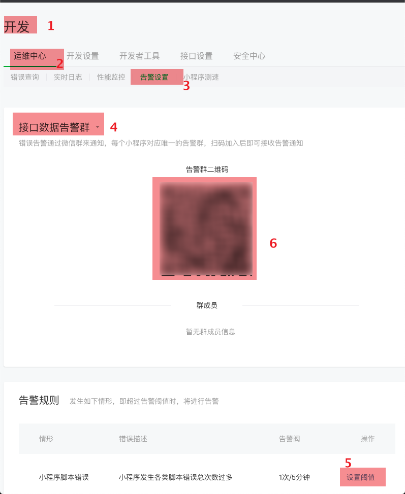 所以,监控小程序运行过程中运行出错很利于小程序的运维工作。官方早就为我们想好了,提供了一个用来监控错误并报警的平台。只是很多人没有好好利用起来。小编从去年开始接触小程序用了将近1年时间了,老实说为我解决了不少问题。使用教程,如图登陆小程序后台后按1,2,3,4,5,6步就好了: