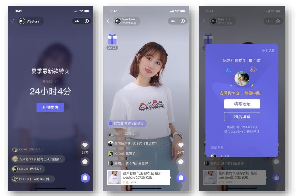 点赞、评论、抽奖等,商家可在直播页推送商品,目前商城最多可添加2000个商品;