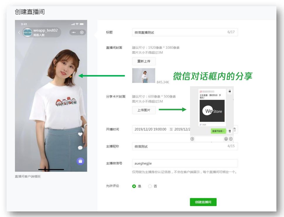 过去微信生态中的公众号、社群、朋友圈图文、视频等内容繁琐、单一,现在通过小程序码海报或卡片,通过微信聊天、微信群、朋友圈分享直播简单高效。