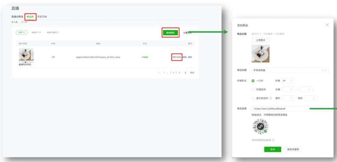 商家添加商品前需进行商品审核/审核 通过后商品将进入商品库,只有商品库 中的商品方能添加到直播间中。