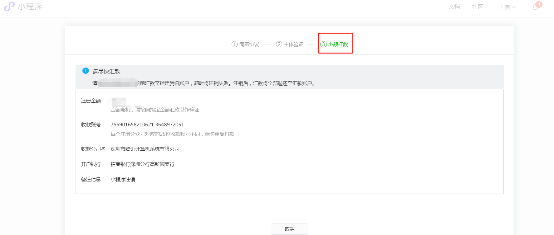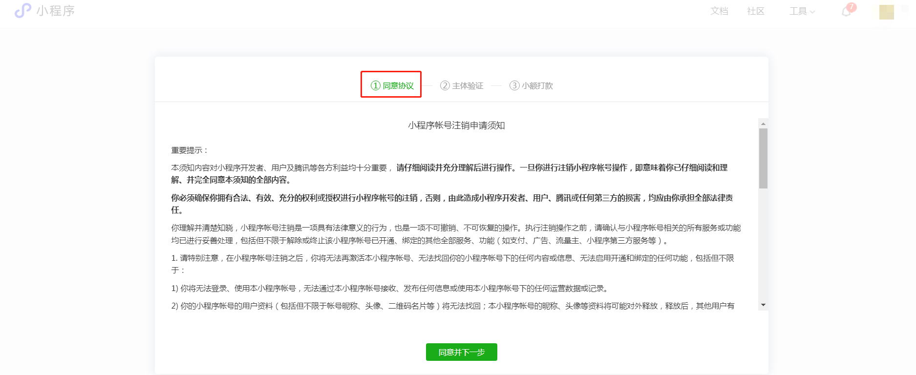 流程:小程序管理员扫码登录微信公众平台--账号中心--暂停服务设置--选择暂停服务--左侧菜单栏版本管理--删除小程序版本--账号中心--账号信息--注销账号--填写信息--打款验证--注销成功--管理员微信收到注销通知