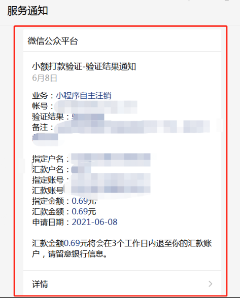 6)打款验证成功/失败:约2个小时左右法人/管理员微信收到验证结果通知