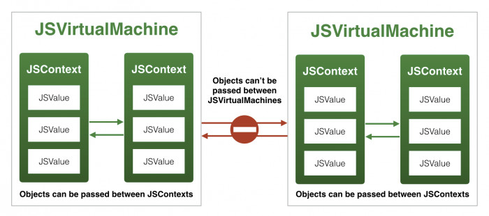 - JSVirtualMachine: 它通过实例化一个 VM 环境来执行 js 代码,如果你有多个 js 需要执行,就需要实例化多个 VM。并且需要注意这几个 VM 之间是不能相互交互的,因为容易出现 GC 问题。