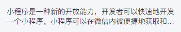 <view class="contentInner2">小程序是一种新的开放能力,开发者可以快速地开发一个小程序。小程序可以在微信内被便捷地获取和传播,同时具有出色的使用体验。</view>