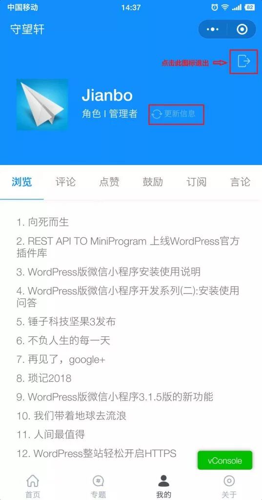 2) 在小程序端的“我的”页面的调整。在“我的”页面增加了用户的角色,显示当前用户在wordpress网站里的角色;增加了更新用户信息和退出登录的功能。