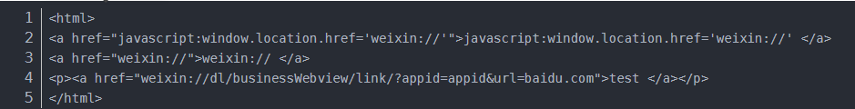 <p><a href="weixin: / /dl/businesswebview/link/?appid=appid&url=baidu.com">test </a></p></html>