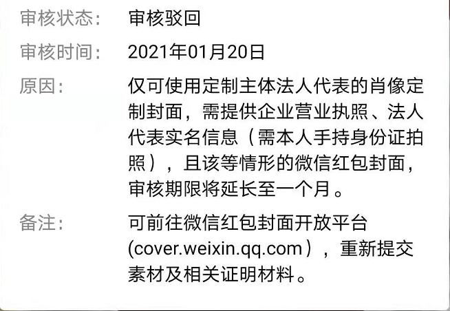 20,仅可使用定制主体本人的肖像定制封面,请提供本人实名信息(需本人手持身份证拍照),且该等情形的微信红包封面,审核期限将延长至一个月。