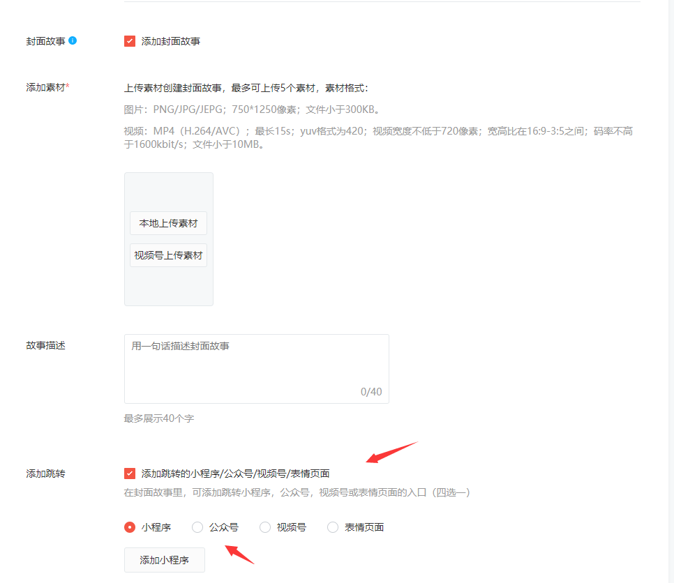 和个人封面定制大体流程一致,只是在封面故事部分增加了小程序或公众号的跳转。