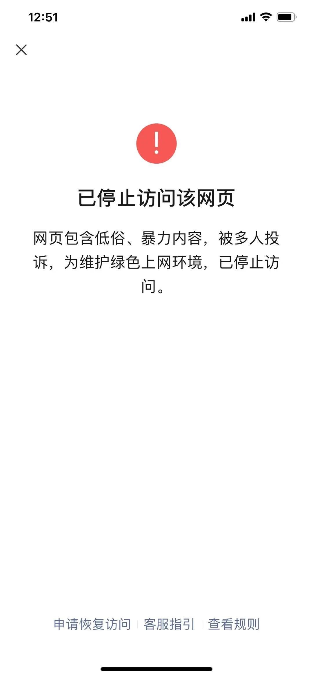 在微信中访问违规网站时会被拦截在以下页面,可以点击申请恢复访问进行申诉。