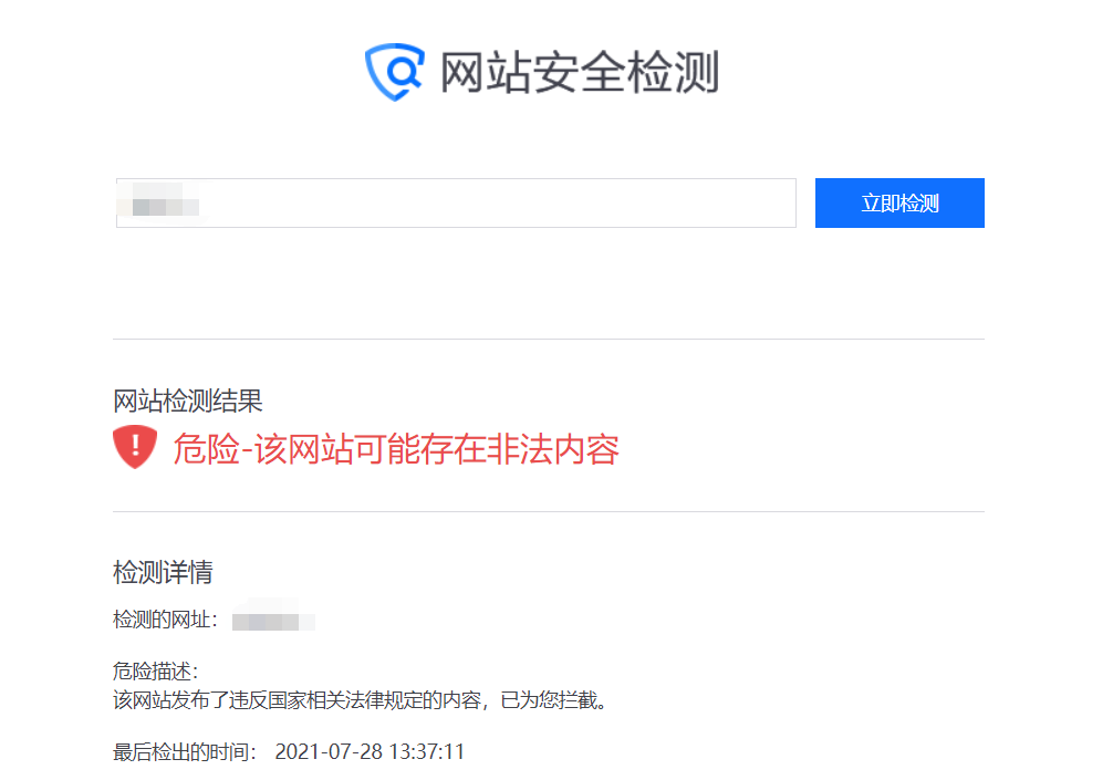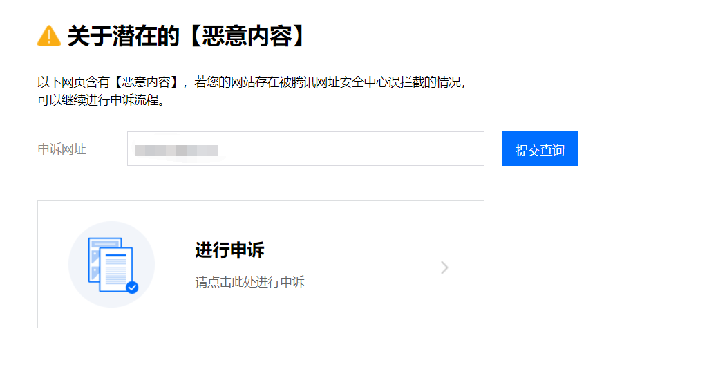 如果检测结果正常,但是域名仍被限制访问,可能原因是之前因为违规内容而被拦截。进入网站拦截申诉,可以看到提示存在潜在的【恶意内容】:
