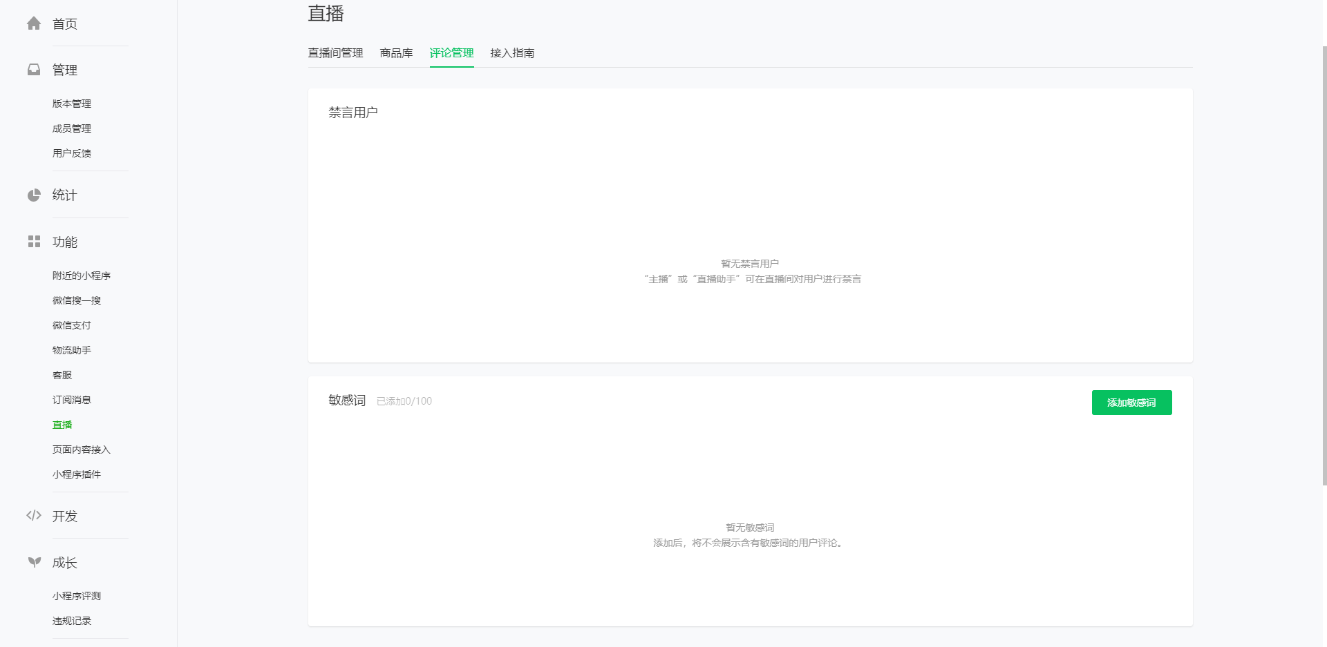 近期已上线新功能:评论管理,支持对单个用户进行禁言,与敏感词设置。