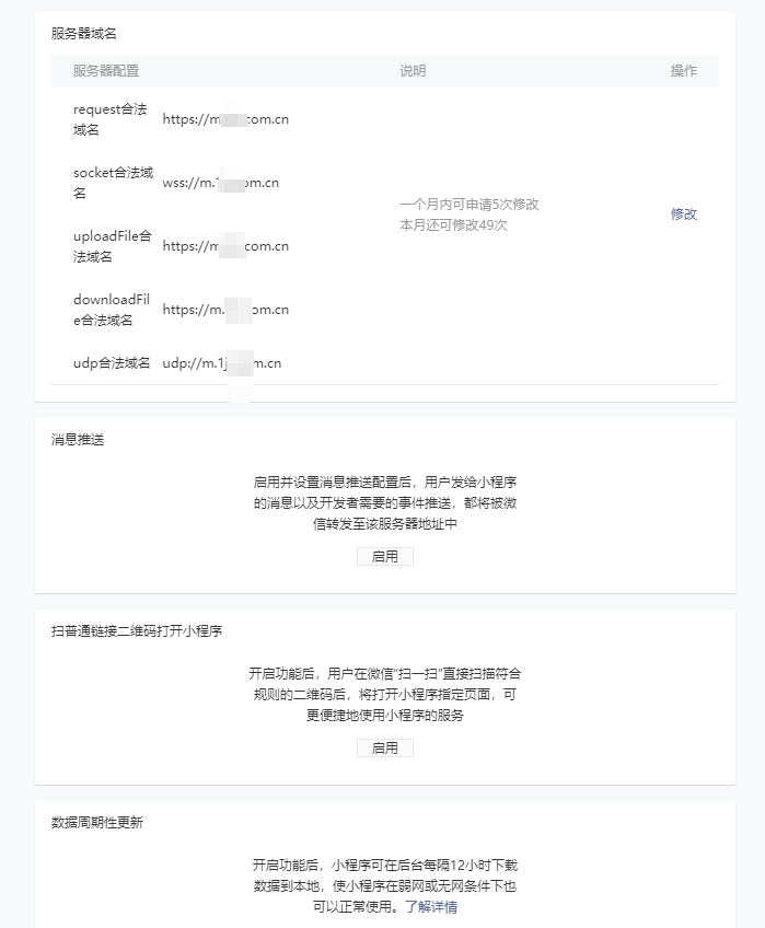 由于内嵌webview是企业主体才有的,所以以下截图对企业而言,个人小程序后台是没有业务域名配置入口的,这一点需要注意,因为我刚才用我个人的小程序找了半天,没有找到业务域名的配置入口