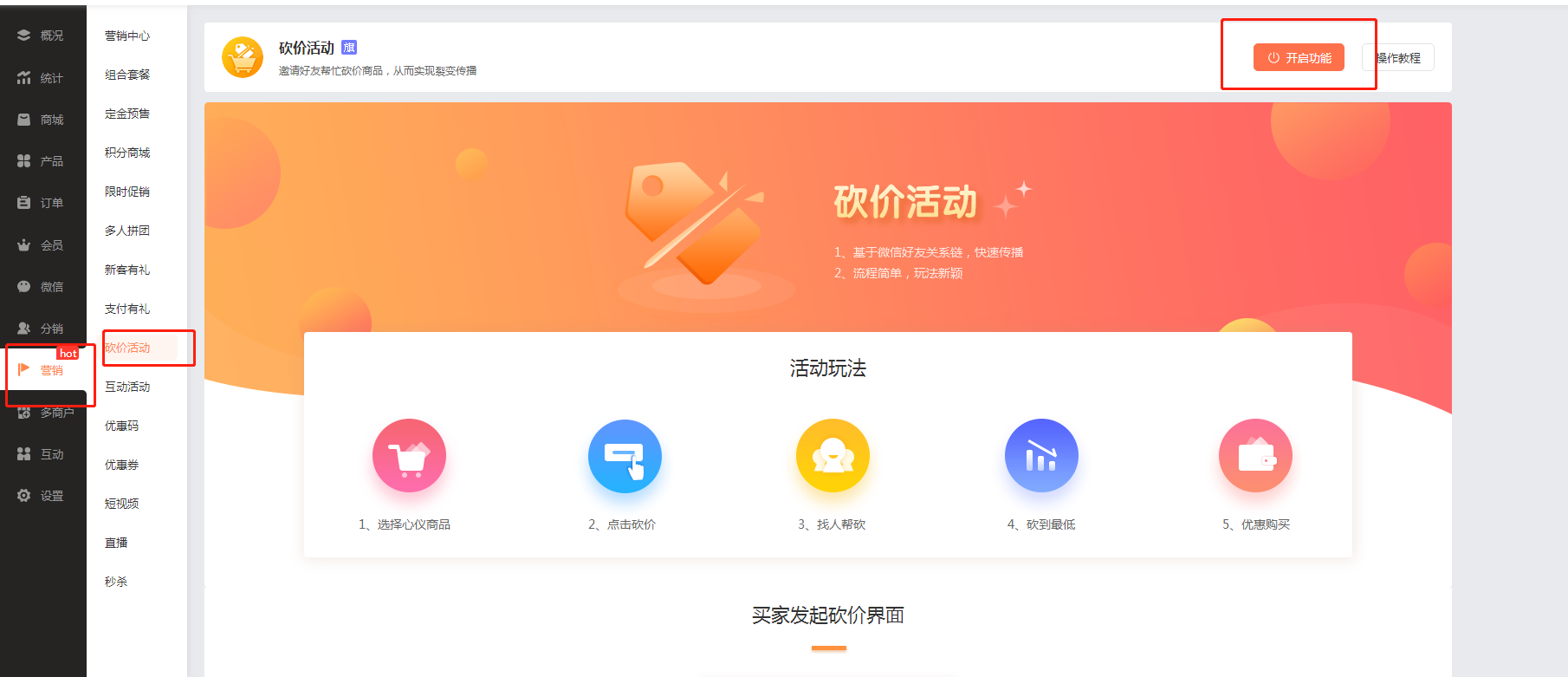 商家进入【商城管理后台-营销-砍价活动】中,可开启砍价活动功能。