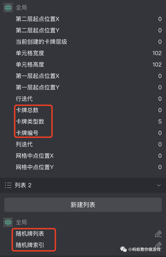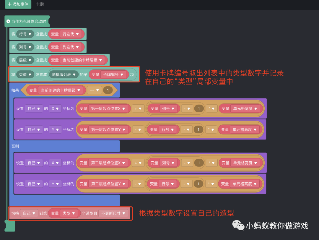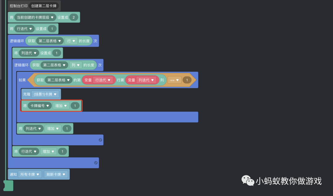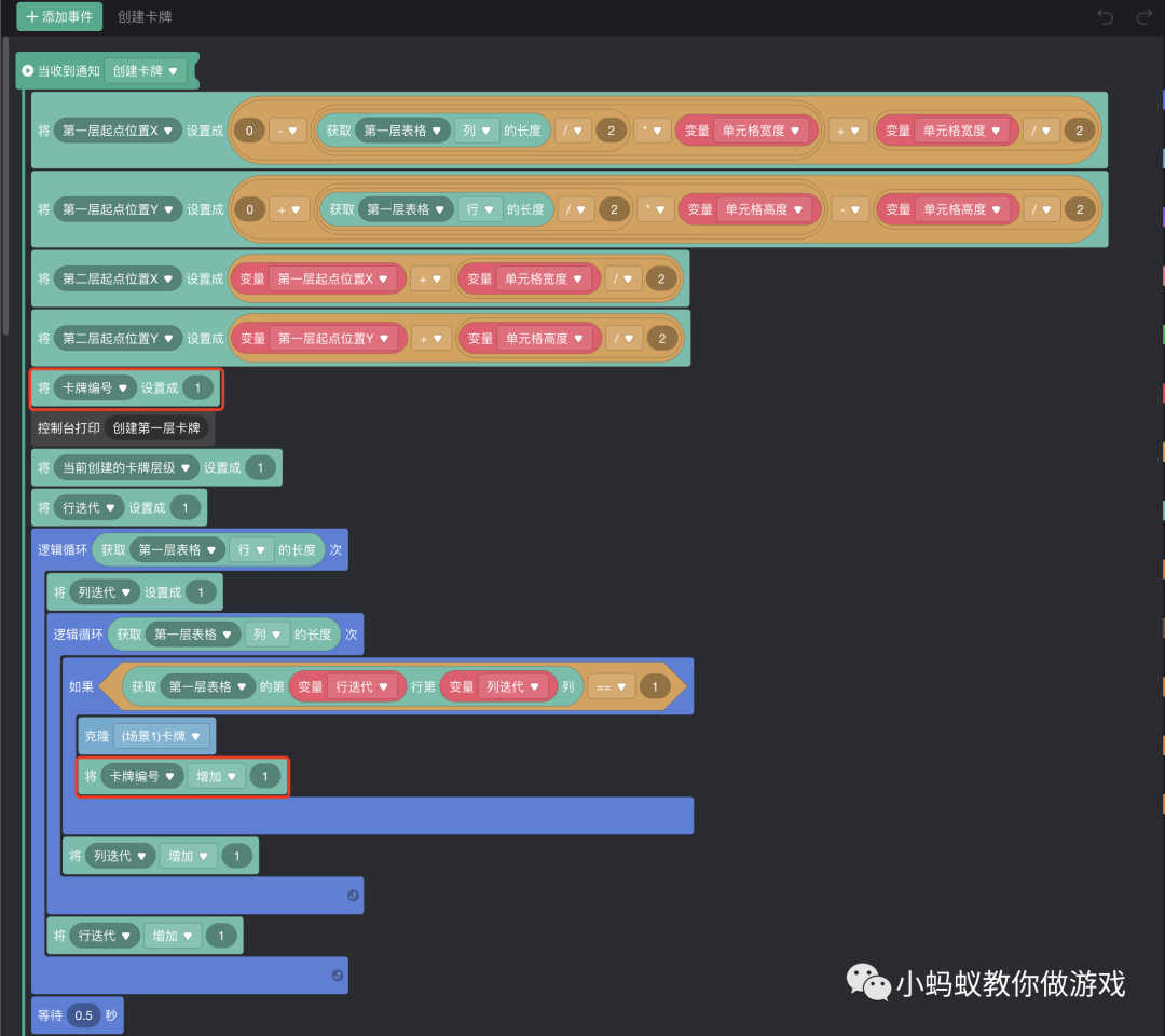 图中红线圈出的就是在之前的逻辑上新增的积木,创建卡牌之前,先将“卡牌编号”设置为 1,然后每创建一张牌,这个数字就加 1。