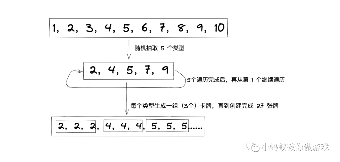 这一点明白了,再回来看我们的游戏,假设我们设置这个关卡一共会出现 5 种不同类型的卡牌,那么整个生成过程就可以像下面这样。