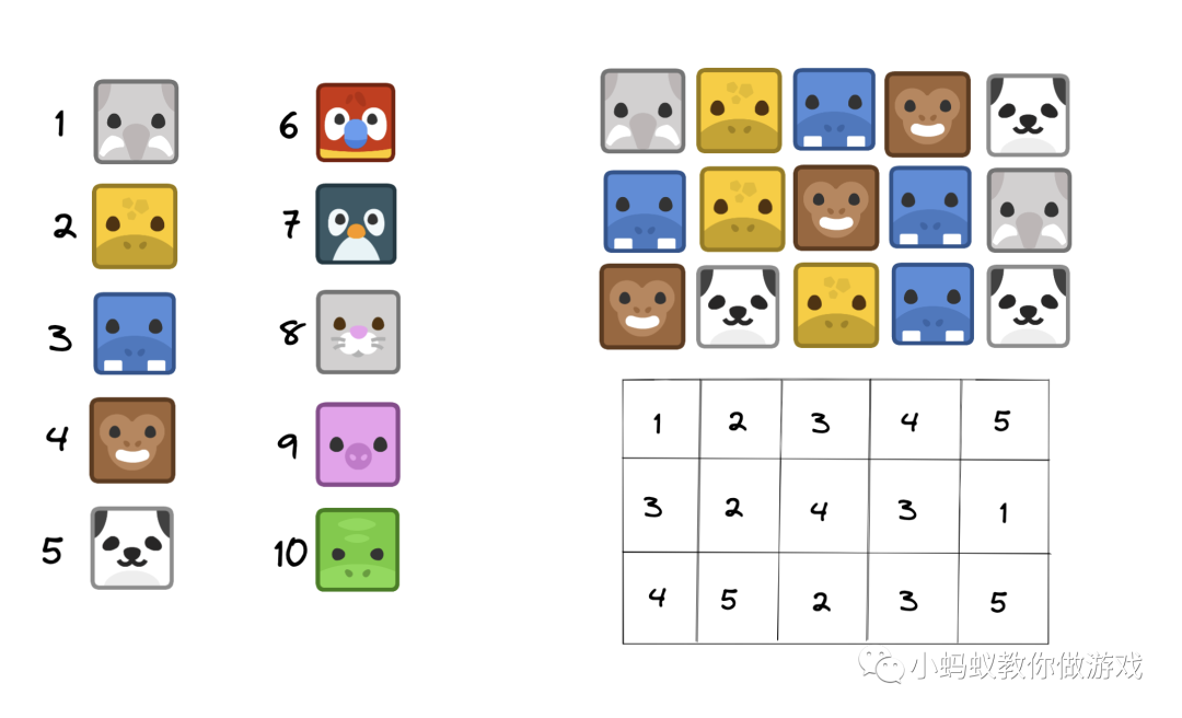 如图,每一个数字代表一种类型的卡牌。一个数字就等同于一个动物头像,这个其实就是所谓的数据抽象了。
