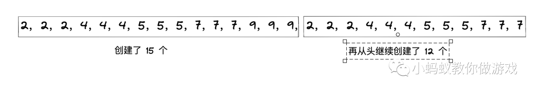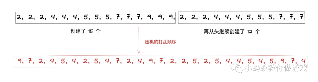如何生成有限制的随机牌呢?我们可以一组一组的去生成,每一组都是三张相同的牌,比如说现在总共要生成 9 张牌,卡牌的类型为 1~5 的五种类型,那么这个随机生成的过程就是这样的: