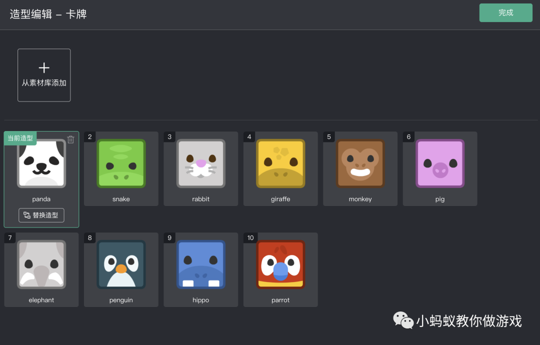 这些小动物头像的素材我给大家打包好了,可以在我微信公众号【小蚂蚁教你做游戏】中回复“动物头像”获取,或者你也可以使用自己的图片素材,只要能够区分不同的卡牌即可。