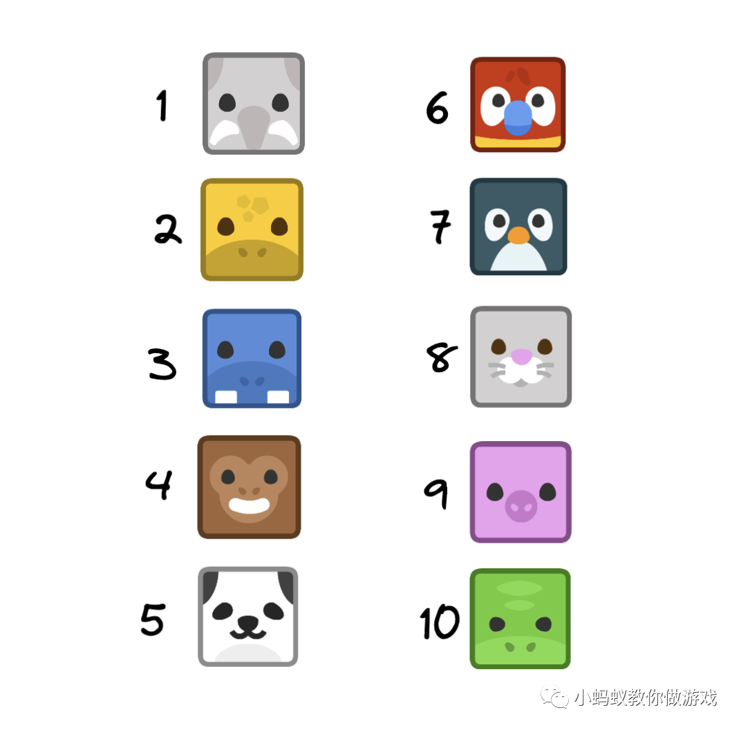 还是先从理论开始,一共有 10 种不同类型的小动物卡牌,我们先给它们依次编上序号。