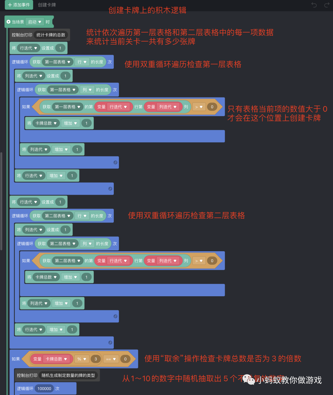 逻辑刚开始,我们通过依次遍历两个表格中的每一项,来统计卡牌的总数。这里为什么不直接设置成 27 ,而要这么麻烦呢?是因为我们的关卡不一定总算是满满当当的 27 张牌,每一个关卡的游戏布局可能都不一样,卡牌的总数可能也会不一样。通过这样的操作,我们就无需每次去数一个关卡中的牌数了,只需要在表格中编辑当前关卡的布局,游戏启动后,程序就会自动帮我们统计的(它总是比我们数的更精确)。