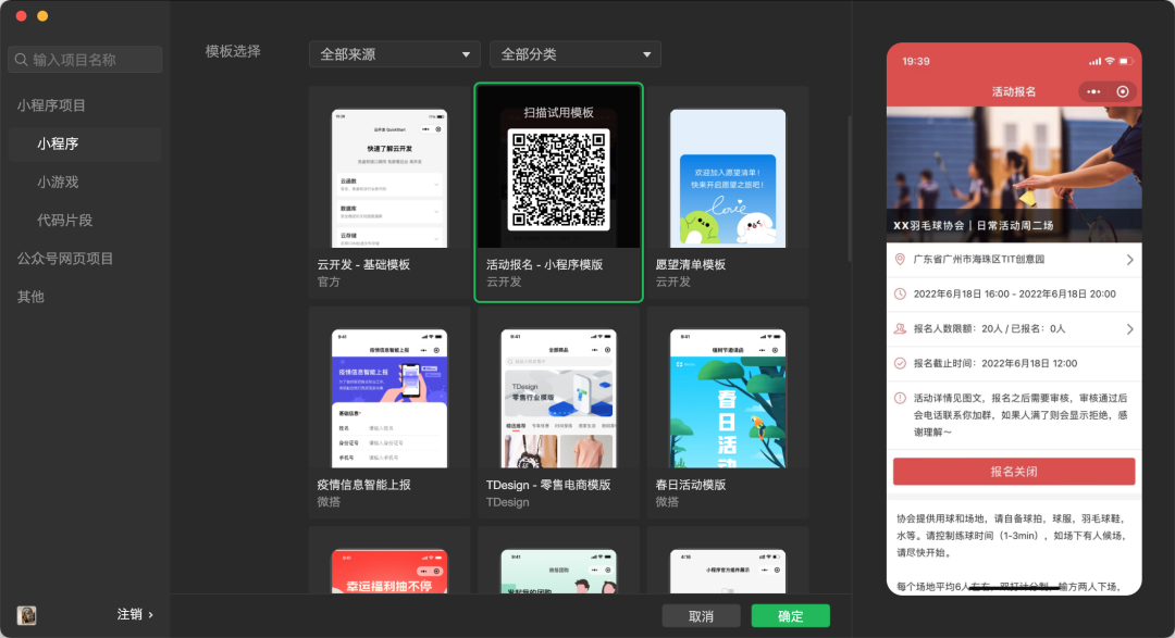 微信开发者工具上线活动报名模板