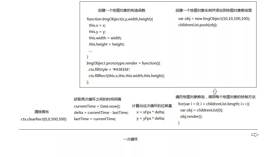 3、遍历绘图对象数组,计算出每一个绘图对象在这一次循环中的最后位置,然后调用其绘制的方法将其绘制到canvas上,这里的绘图对象是通过事先创建好的绘图对象构造函数来创建的,之所以要创建一个绘图对象的构造函数,是因为这些绘图对象都有一些相同的属性和方法,用构造函数的方式会更便于管理这些属性和方法。