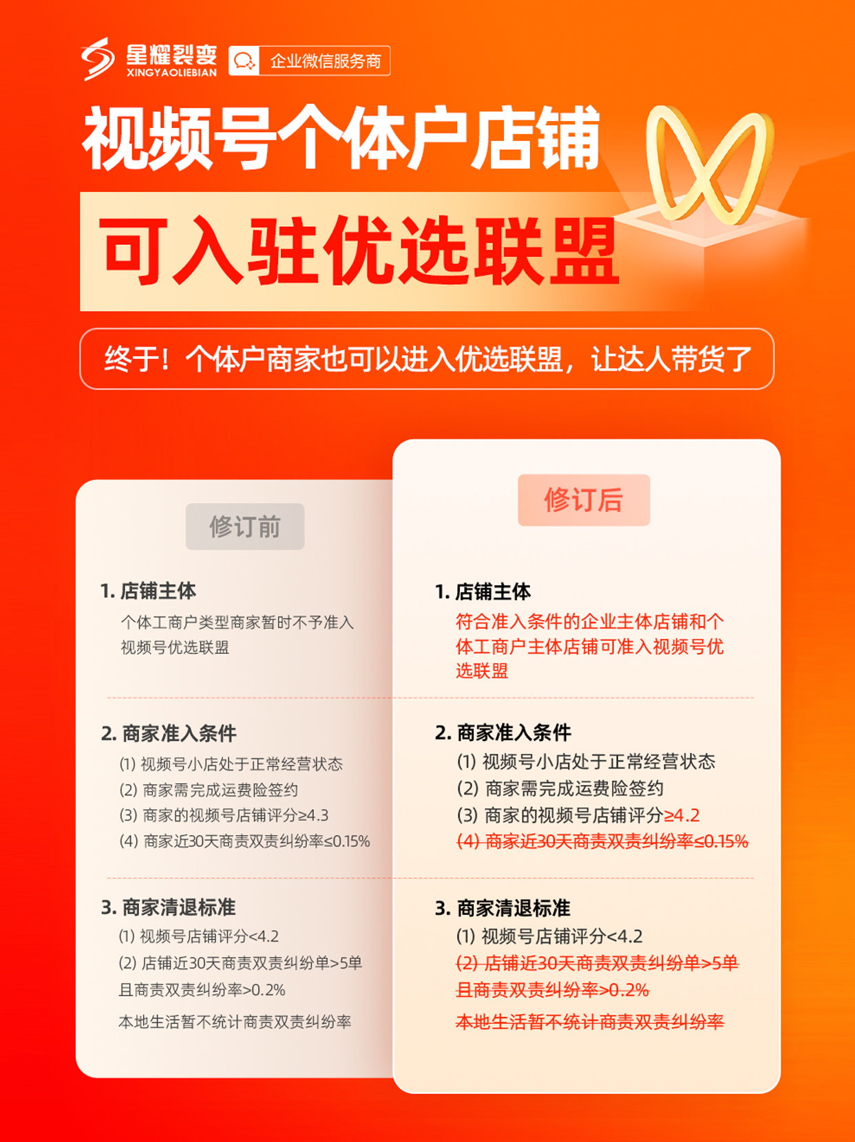 视频号平台发布优选联盟最新公告,将于8月26日正式生效,入驻门槛降低,个体户也可以入驻了。