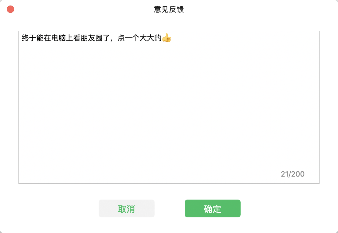 意外发现多了一个意见反馈的功能,这是不是意味着微信mac版将更加的开放,期待未来有更多的功能更新迭代,给开发团队大大的👍