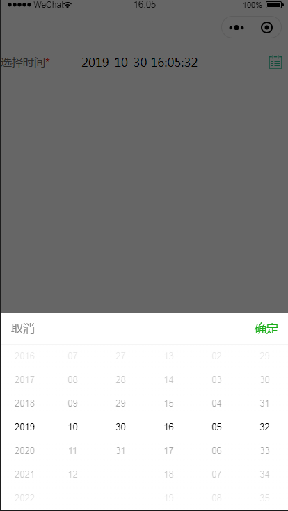 <DateTimePicker title='选择时间' isRequired='true' bind:dateTimePicker='onDateTimePicker' name='time' format='yyyy-MM-dd HH:mm:ss'/>