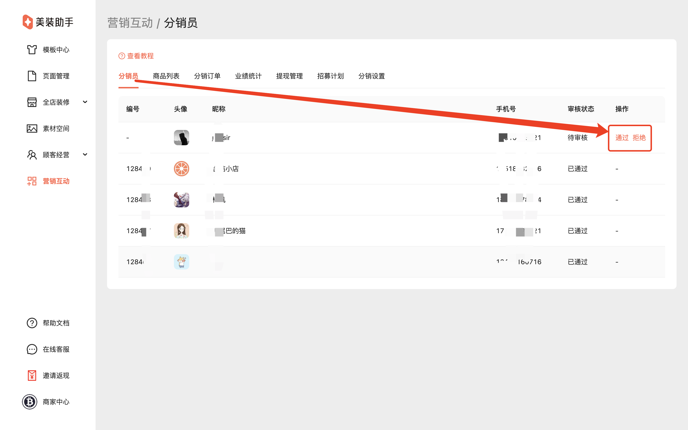 通过招募计划申请的分销员,在分销员列表点击审核或拒绝