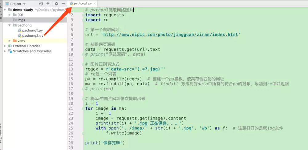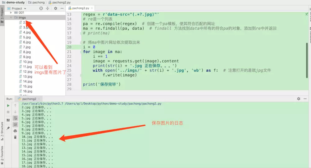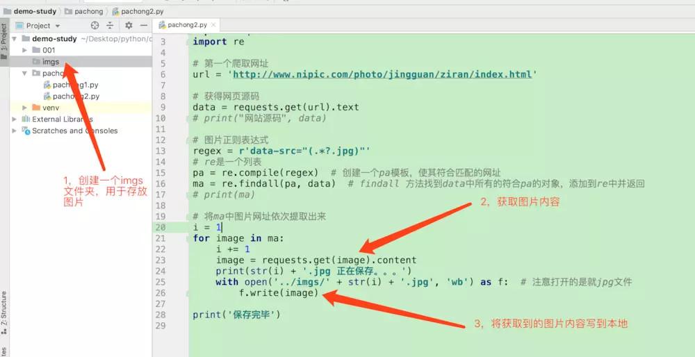 如上图,我们做保存图片的时候,需要先在我们代码的外层目录创建一个 imgs文件夹,用于存放图片。然后编写核心代码。