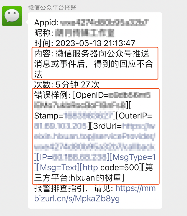 官方也有提供的报警排查指引文档,里面列举了各类报警的排查方法:https://developers.weixin.qq.com/doc/offiaccount/Basic_Information/Warning_Message_Troubleshooting_Guide.html 。