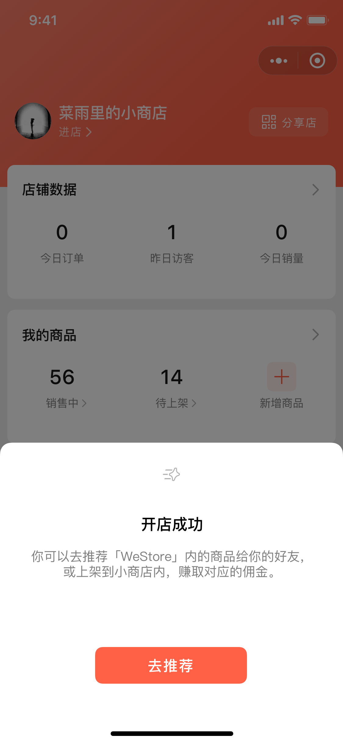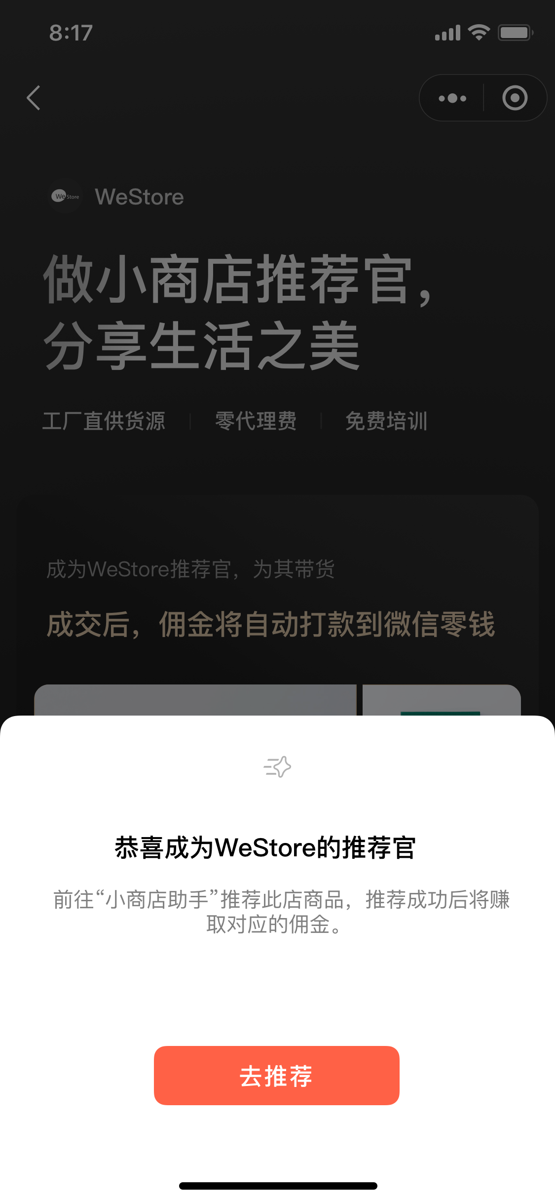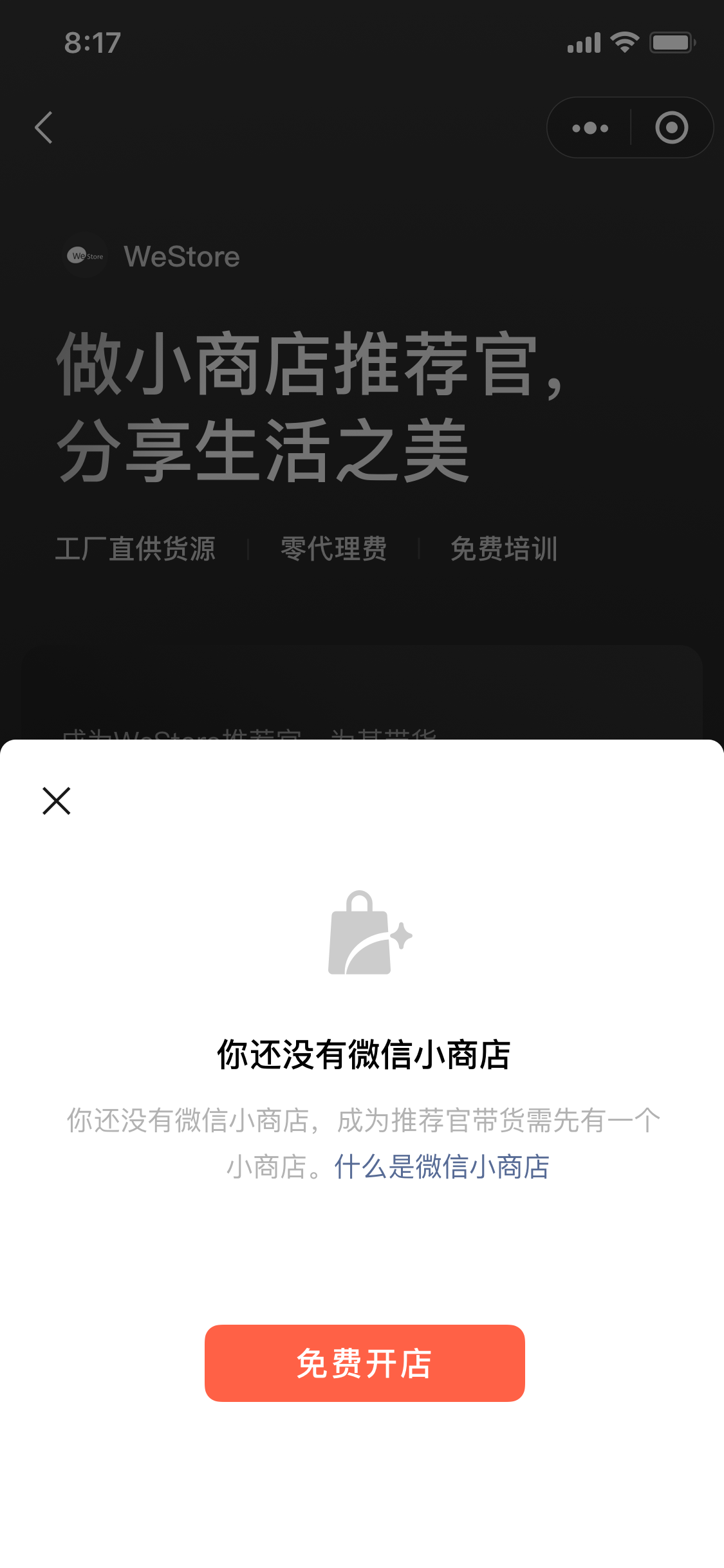 若该用户申请推荐官时还未曾拥有一个小商店,将会引导用户创建小商店开始推荐商品。