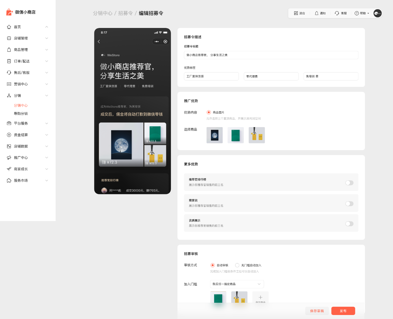 通过设置并发布招募令,设置梯级晋升的佣金激励,商家可募集到愿意为本店带货的推荐官。