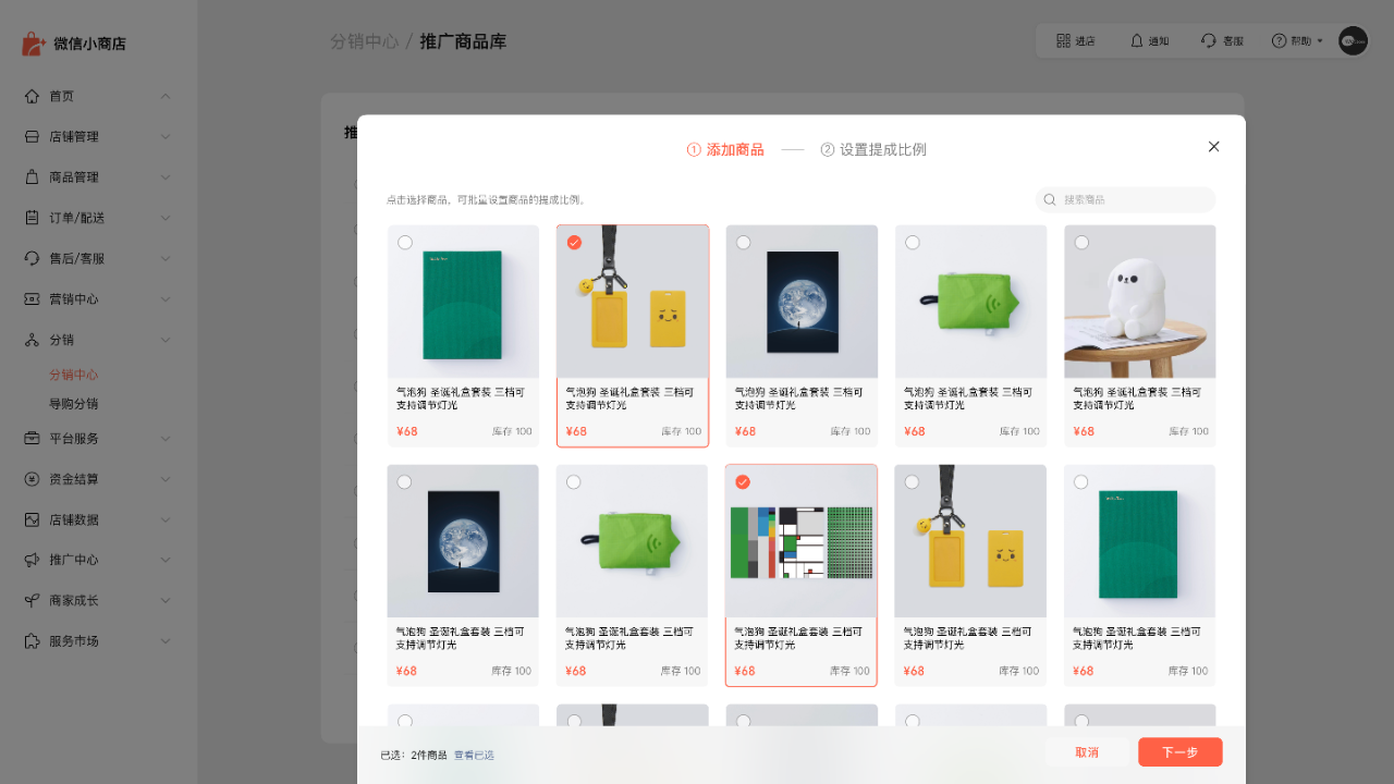 从小商店已添加的上架商品中,选取商品作为推广商品