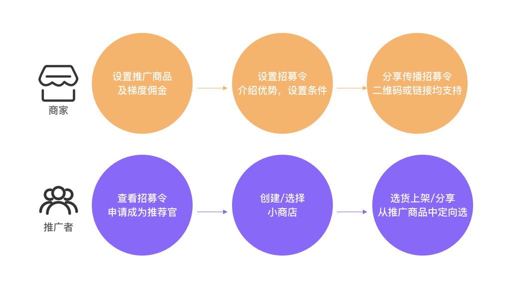 导购分销的导购们为店铺的成员,且不拥有自己的小商店,适合员工场景。推荐官更适合招募非员工的推广人员。