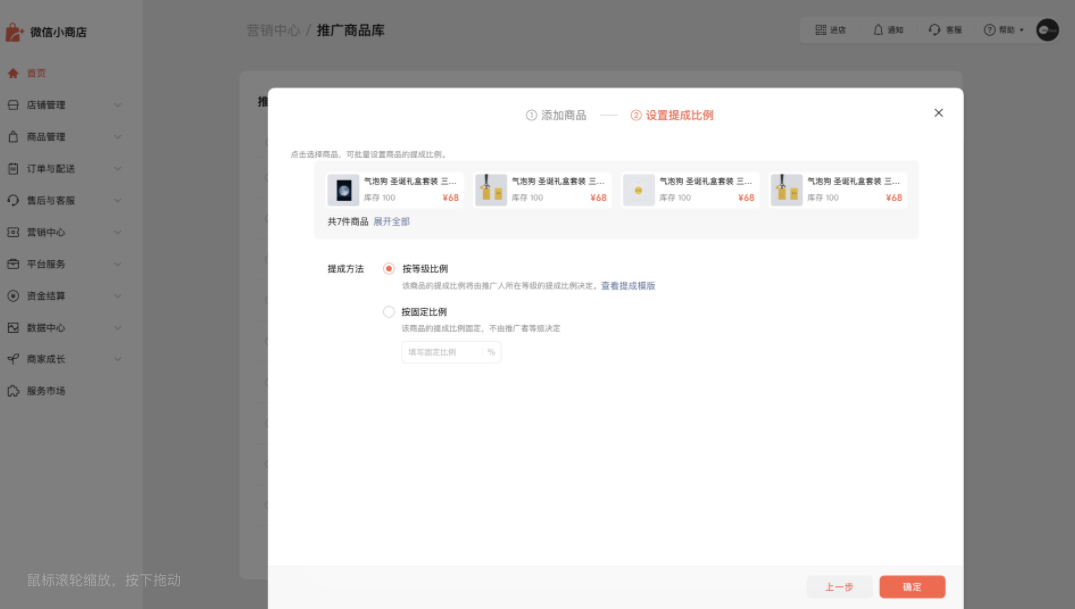 - 按固定比例:固定设置一个比例,提成将会按照商品的实际支付价格乘以这个比例计算。