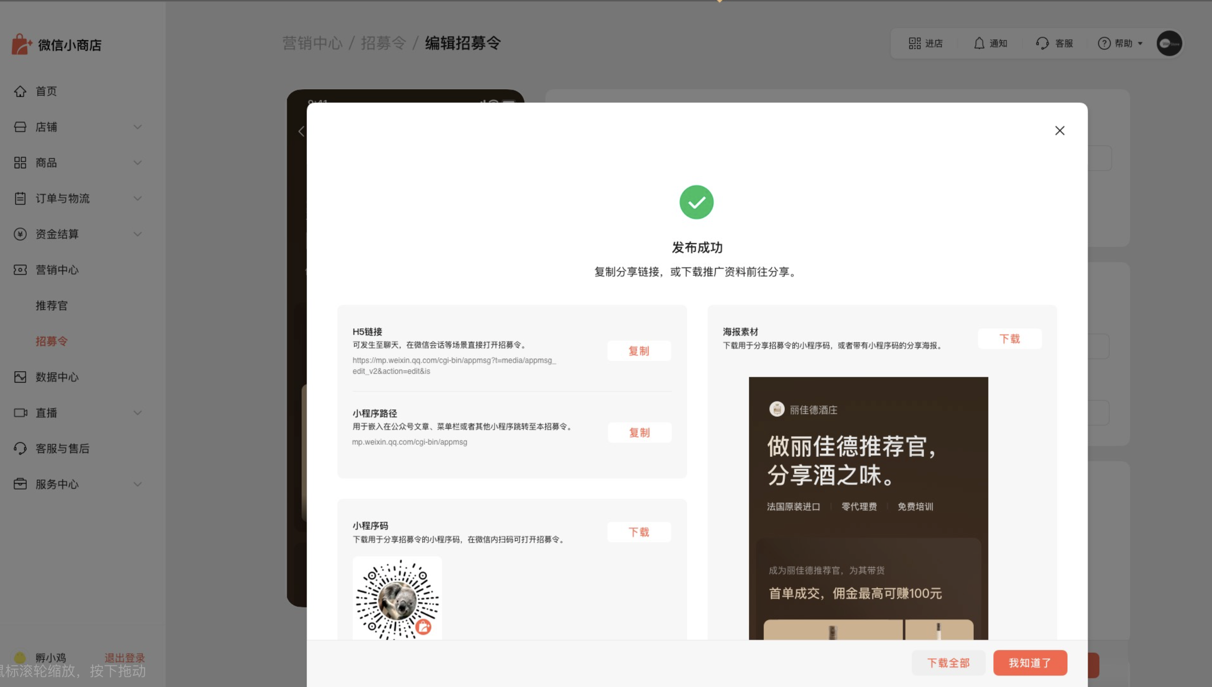 - 小程序码:招募令页面的小程序码,用户扫码后将会直接打开招募令页面,商家可用于设计招募海报加入该码。