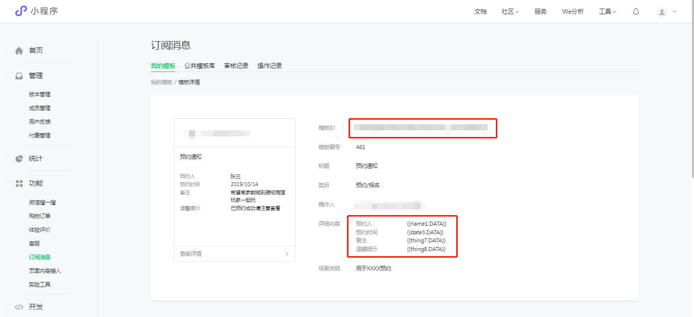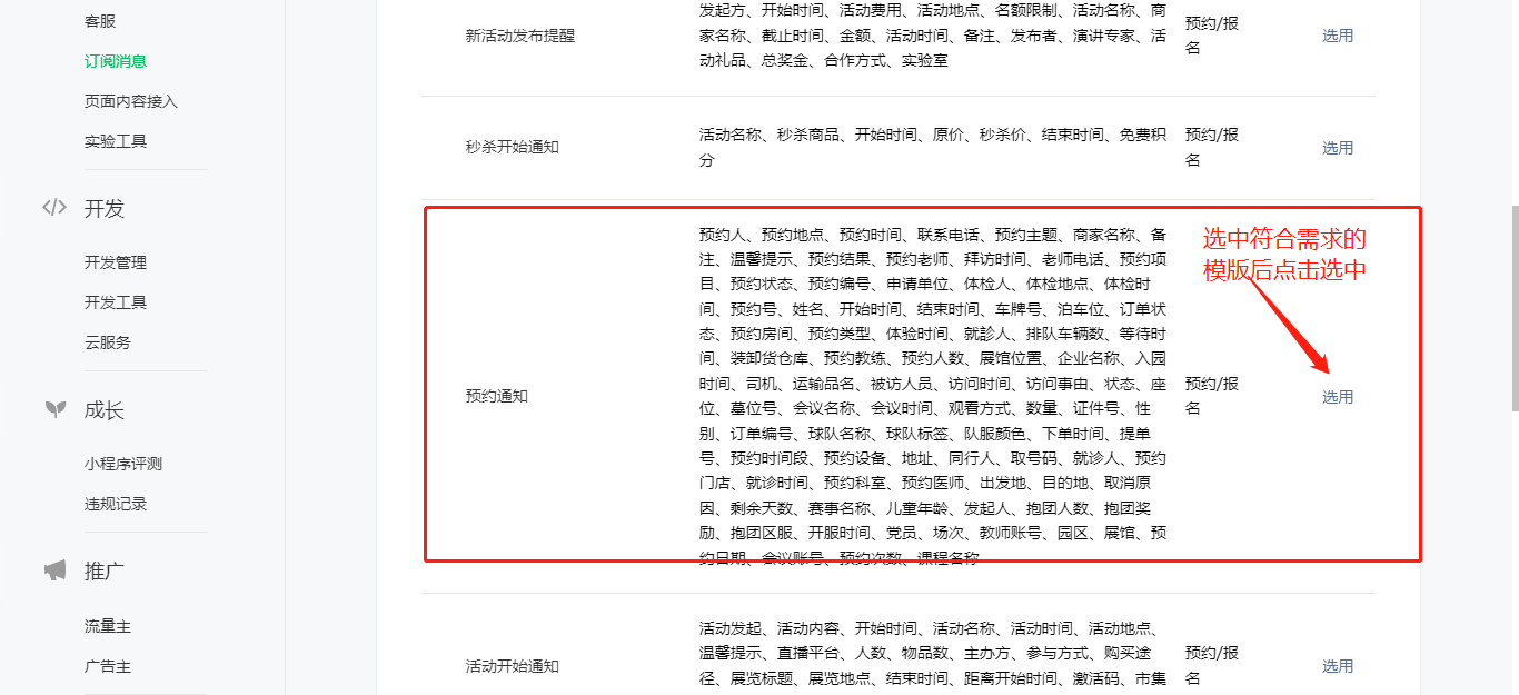 2、选择消息模版。这里以选择《预约通知》模版作为示例