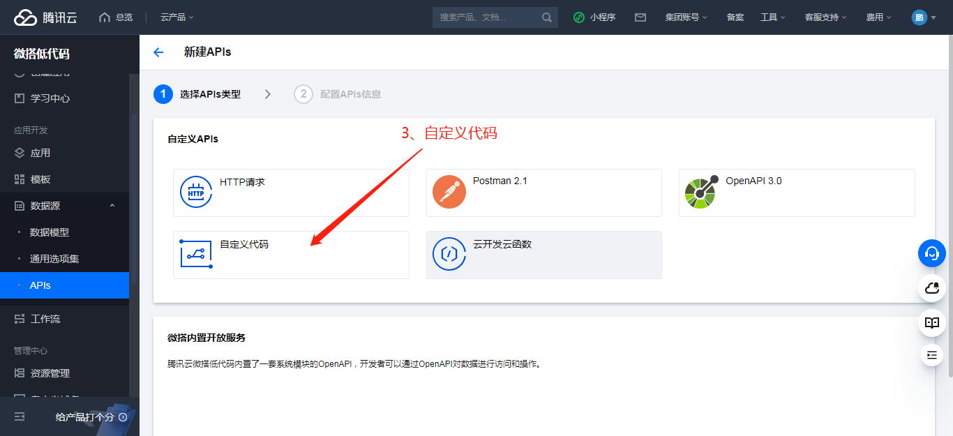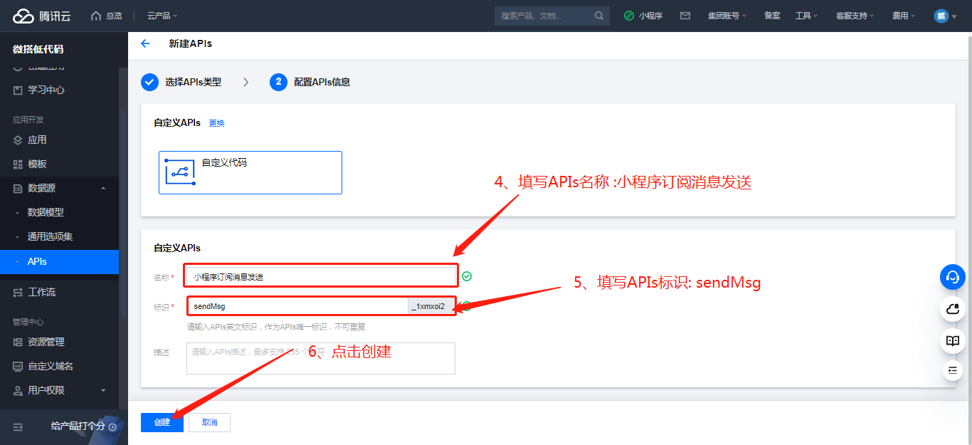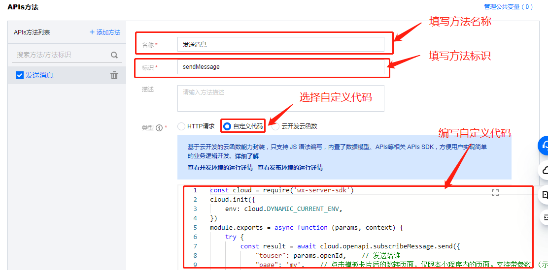 二、新建自定义APIs,编写发送消息函数