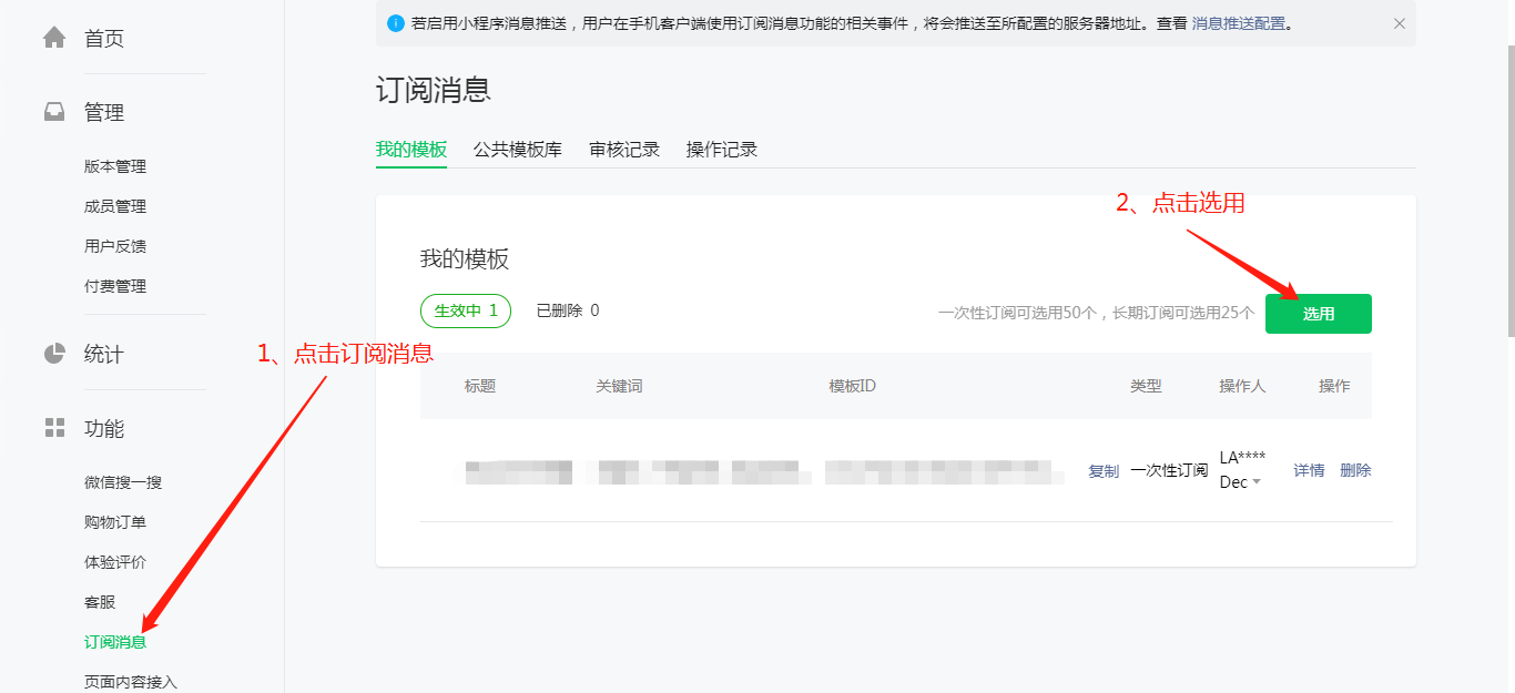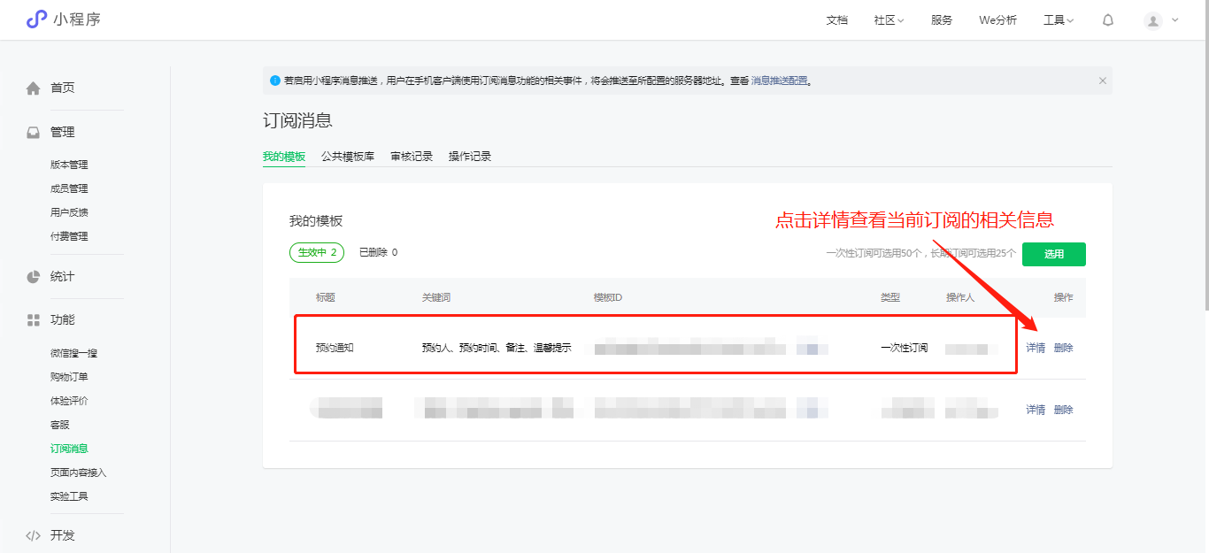 4、提交成功后在会自动跳转至我的模版中,在我的模版中会以列表的形式展示你所有已订阅的模版。查看模版详情可以查看模版的ID以及使用模板所需要的参数