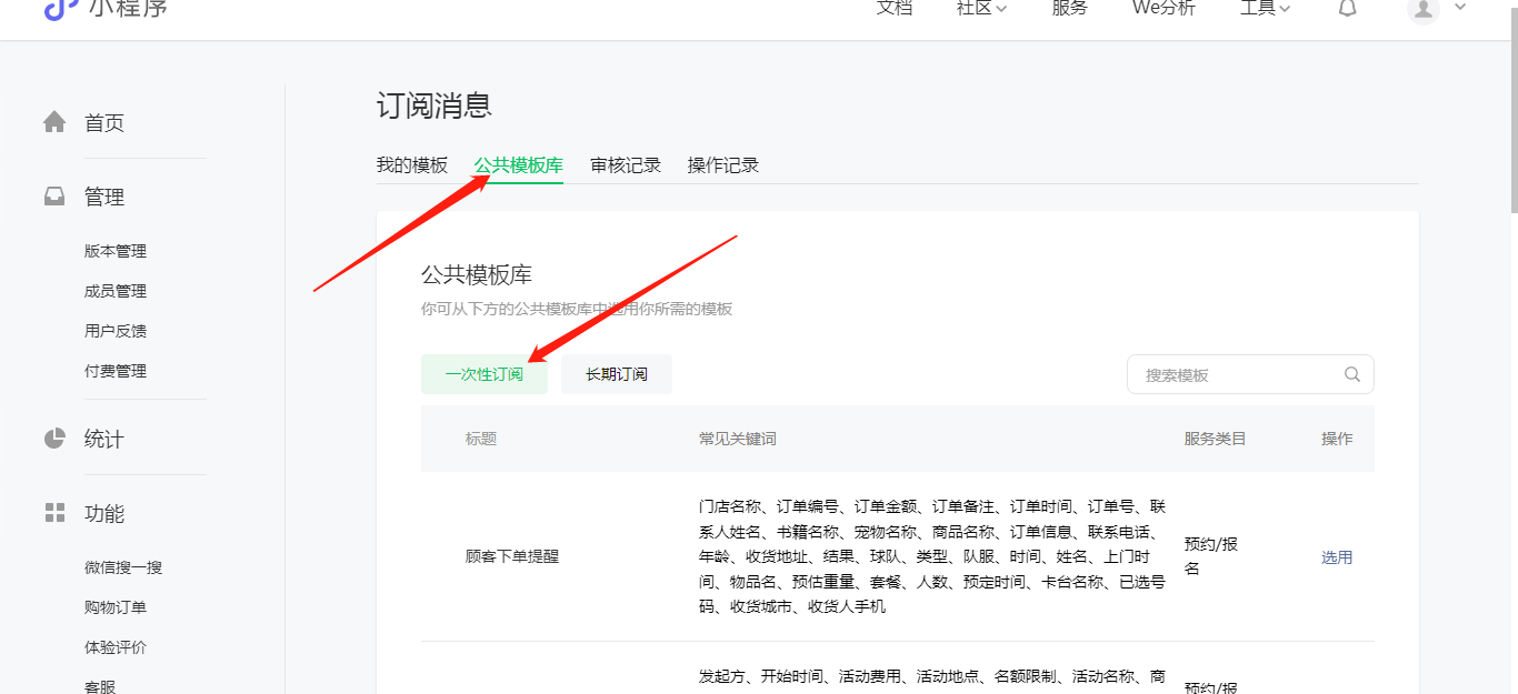1、登录 微信公众号平台 。登录成功后在左侧菜单栏中选择订阅消息菜单,在右侧的面板中单击选用