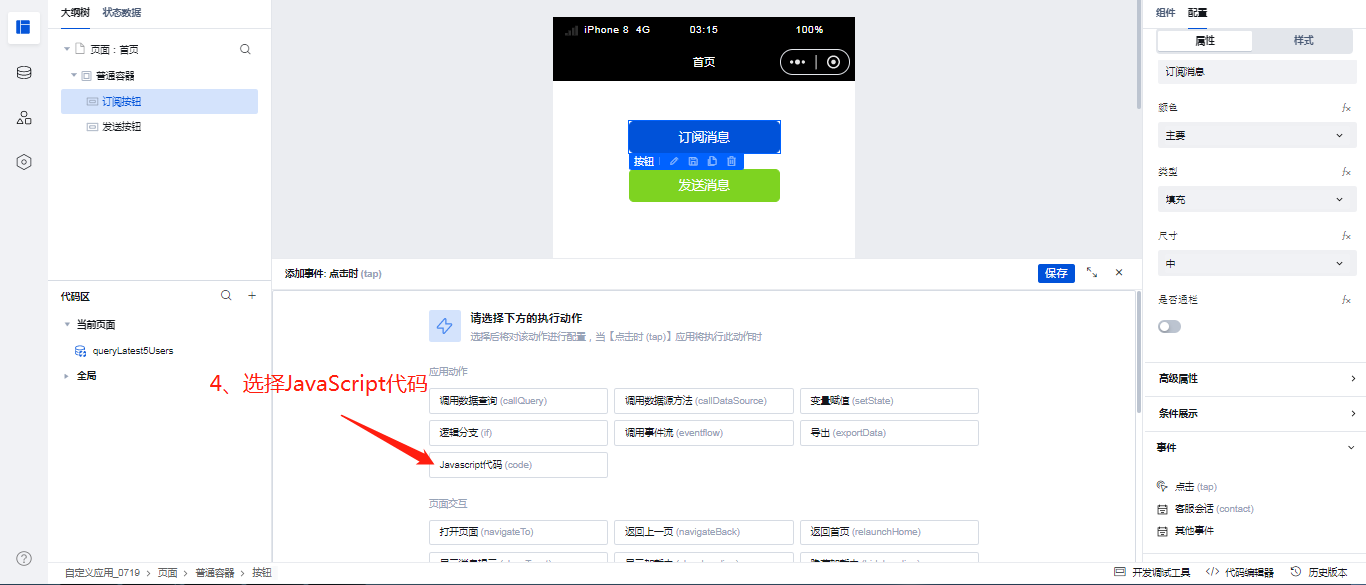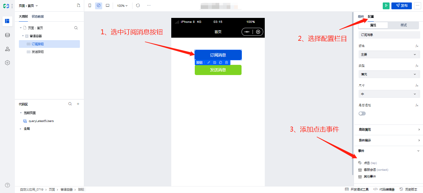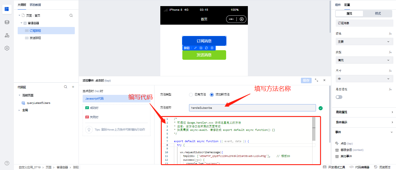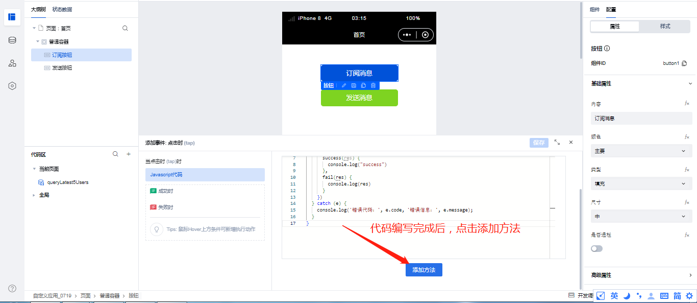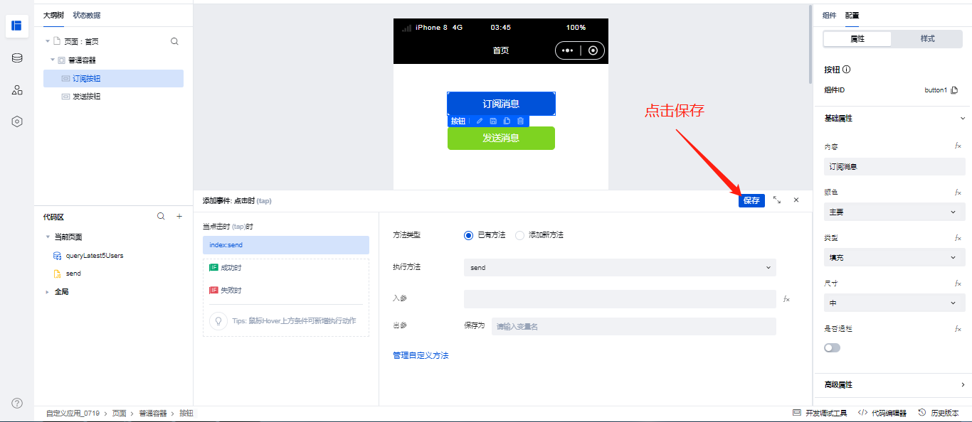 这里给发送按钮绑定点击事件的操作就不做过多的描述,与上面订阅消息按钮绑定事件步骤一致,发送消息的方法名称为: send