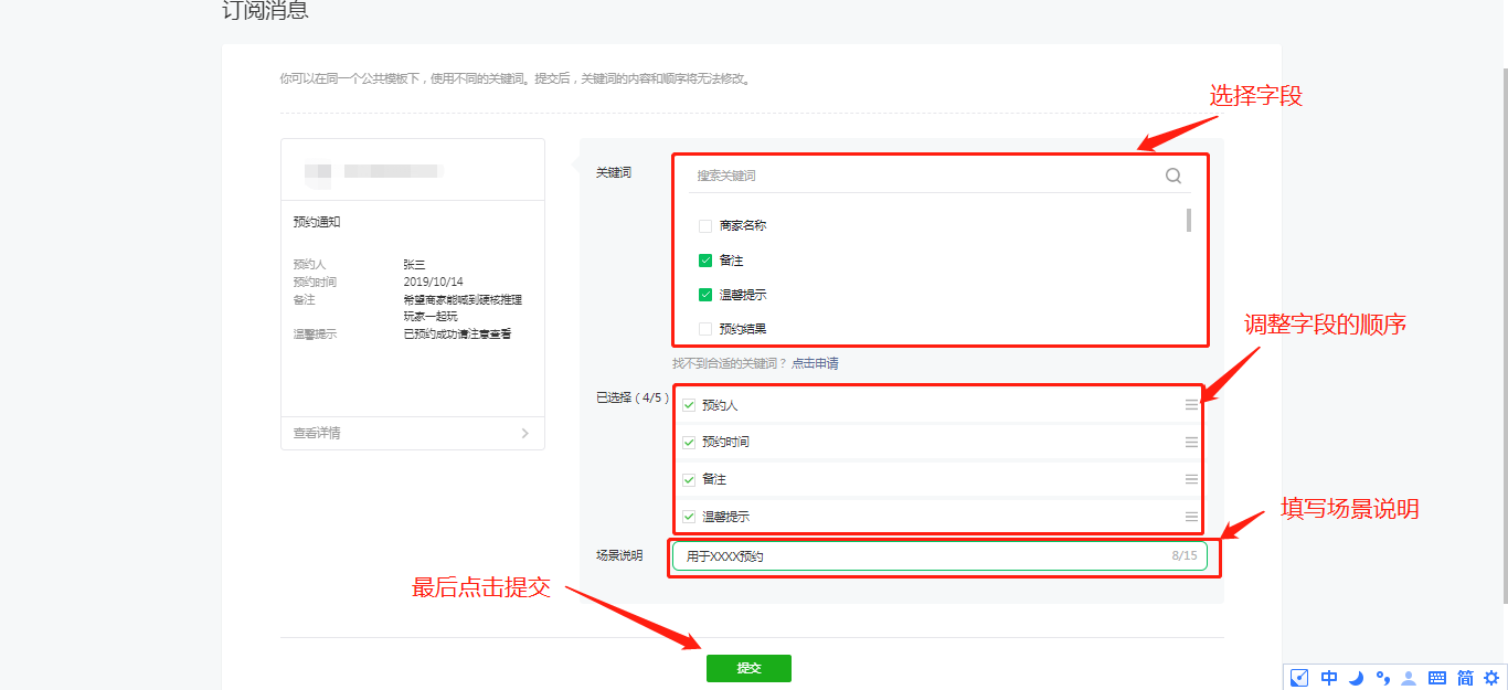 3、选择消息模板的字段(注意最多可选择5个字段),并填写场景说明(按订阅的需求填写)