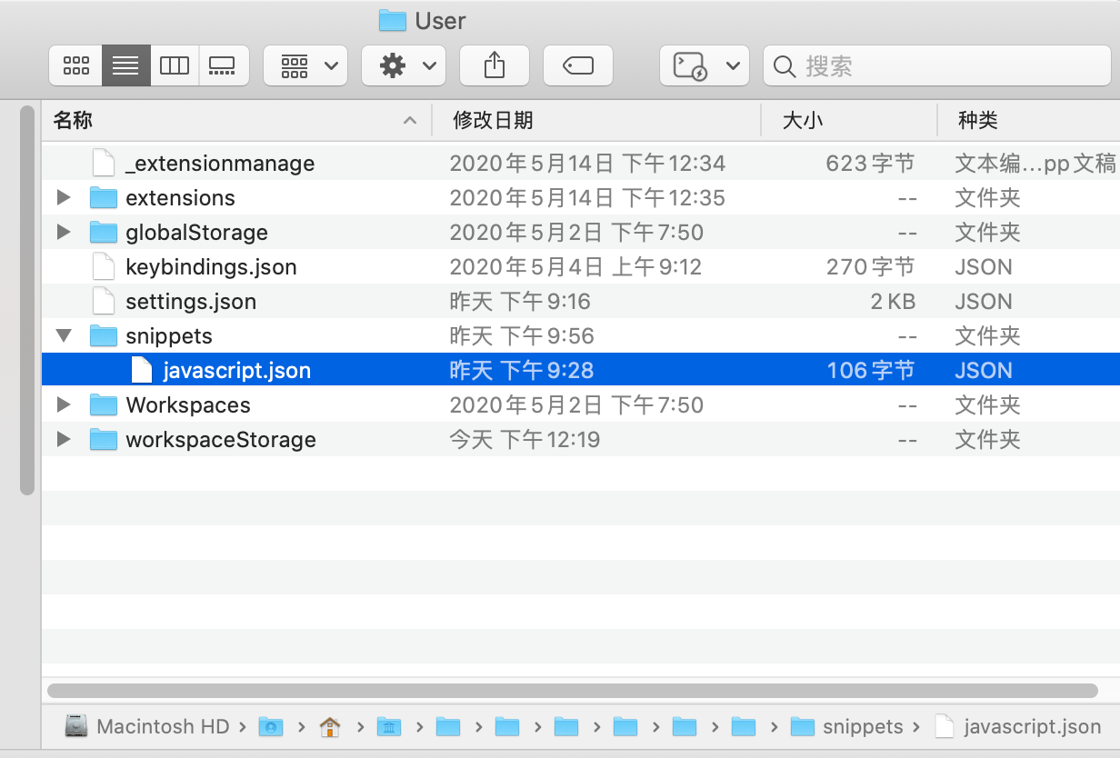 返回上一级目录到User目下(里面有Workspaces文件夹),创建/进入snippets,此目录mac下完整路径应为:"~/Library/Application Support/微信开发者工具/【当前开发者工具特征码】/Default/Editor/User/snippets"